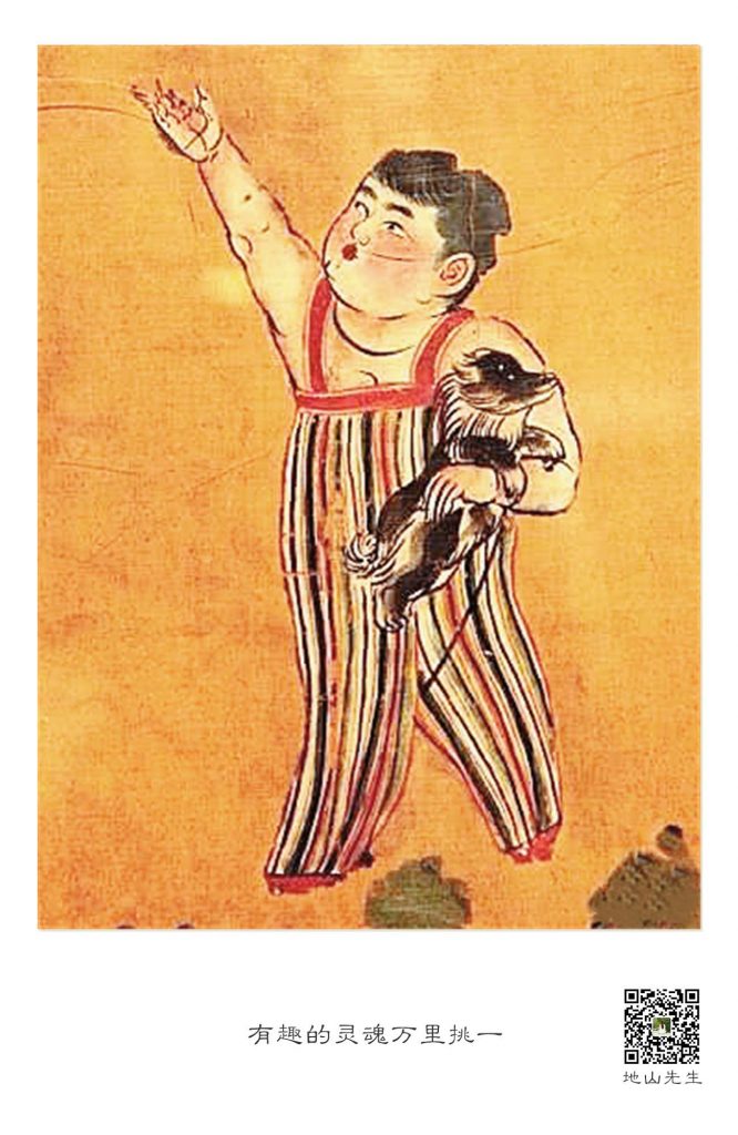 其中左边的孩童👆右手高高举起作放飞状,似乎正要放掉刚刚抓住的飞虫,左手抱着一只黑白相间的卷毛小狗;右边的孩童👇则紧皱眉头,睁大眼睛像是发现了什么,急切地呼唤同伴的注意。