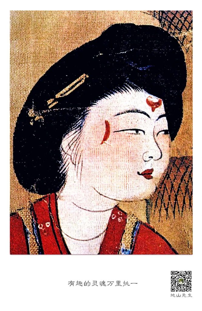 虽说在白白净净的脸上,画这种伤疤似的妆容有些另类,但在当时,却是一种非常时髦的妆容,不仅在宫娥舞姬间流行,连大家闺秀也醉心此妆。